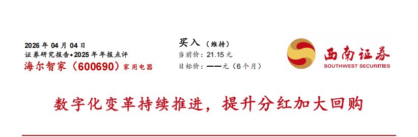 在股东回报方面,西南证券提到,海尔智家2025年现金分红比例提至55%,并规划2026-2028年分红比例持续提升,同时拟斥资10-20亿元回购A股,彰显长期发展信心。