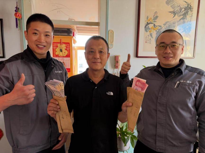 故事要从用户翟先生为岳父岳母的老房子更换热水器说起。当天,王振、倪晨皓两位海尔服务师按约定上门作业,拆旧机、测量、安装,每一步都认真细致。就在拆卸旧热水器时,两位师傅在机器夹缝中发现了用塑料袋包裹得整整齐齐的一万元现金。他们没有丝毫犹豫,第一时间将钱款原封不动交还给用户。经了解,这笔钱是翟先生已离世十年的岳父留给孙子、孙女的遗物。