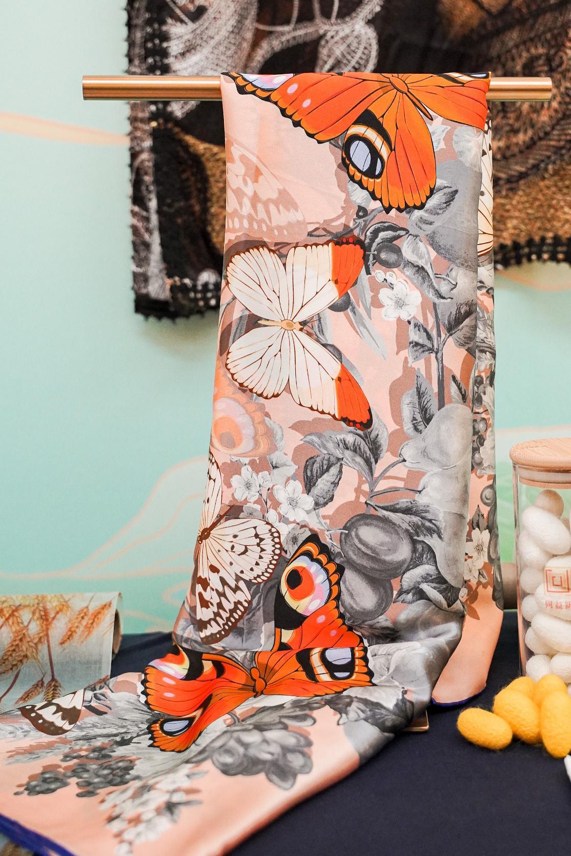 以丝绸作为面料的丝巾质地顺滑,色彩艳丽,富有光泽感。振翅欲飞的蝴蝶图案栩栩如生,橘橙色主调活泼明快,这款丝巾漂亮又精致,触摸细腻柔滑,令人爱不释手。