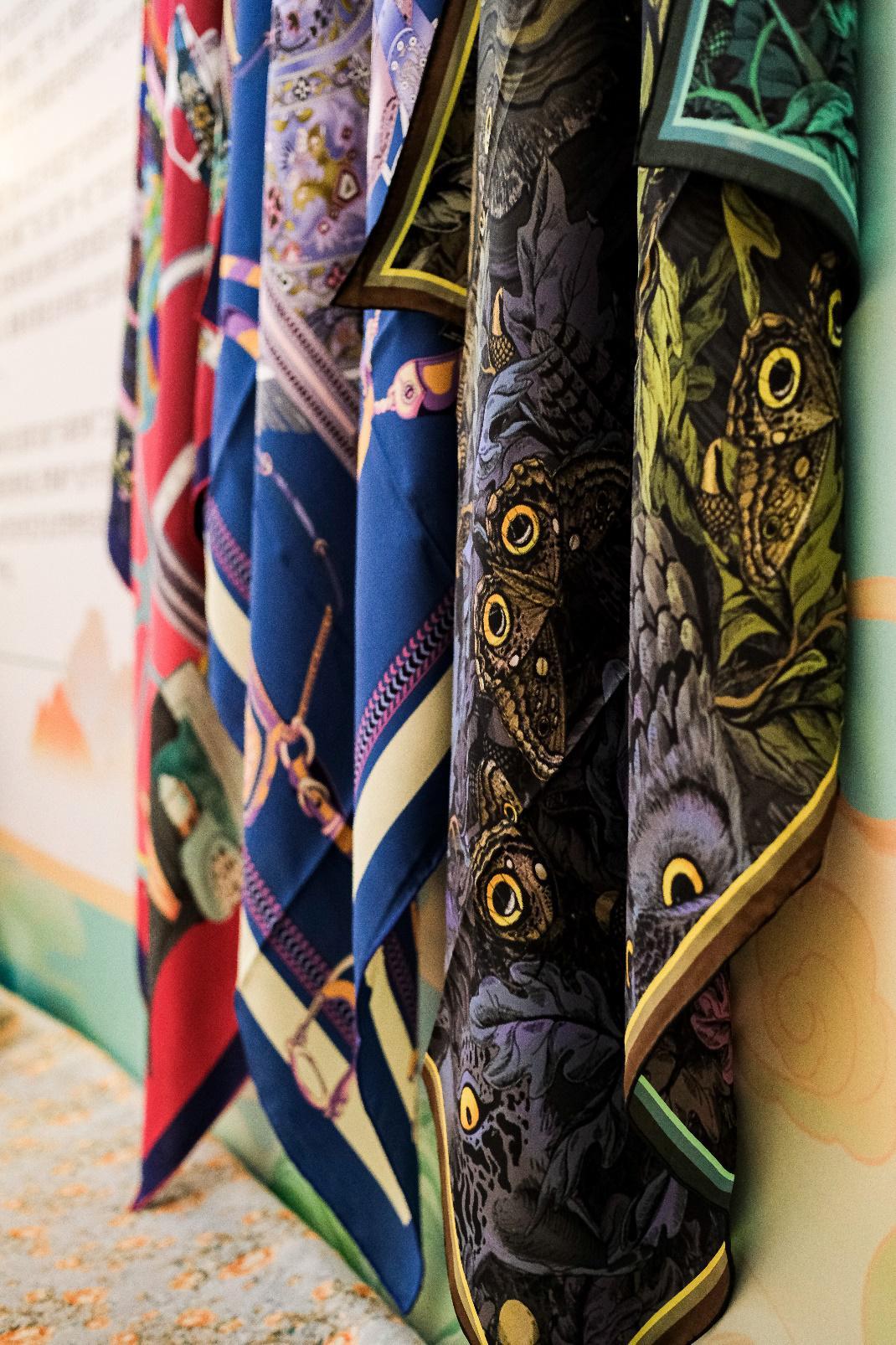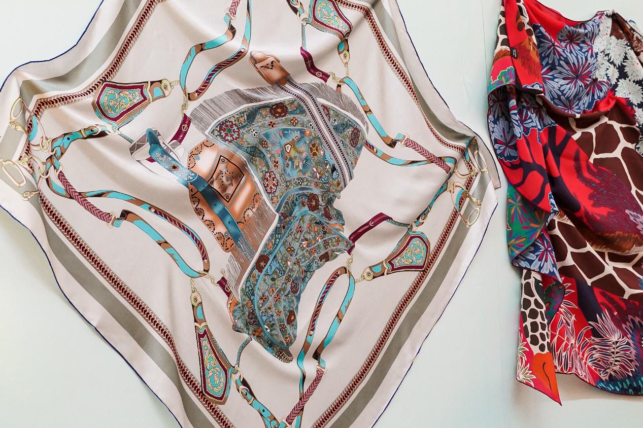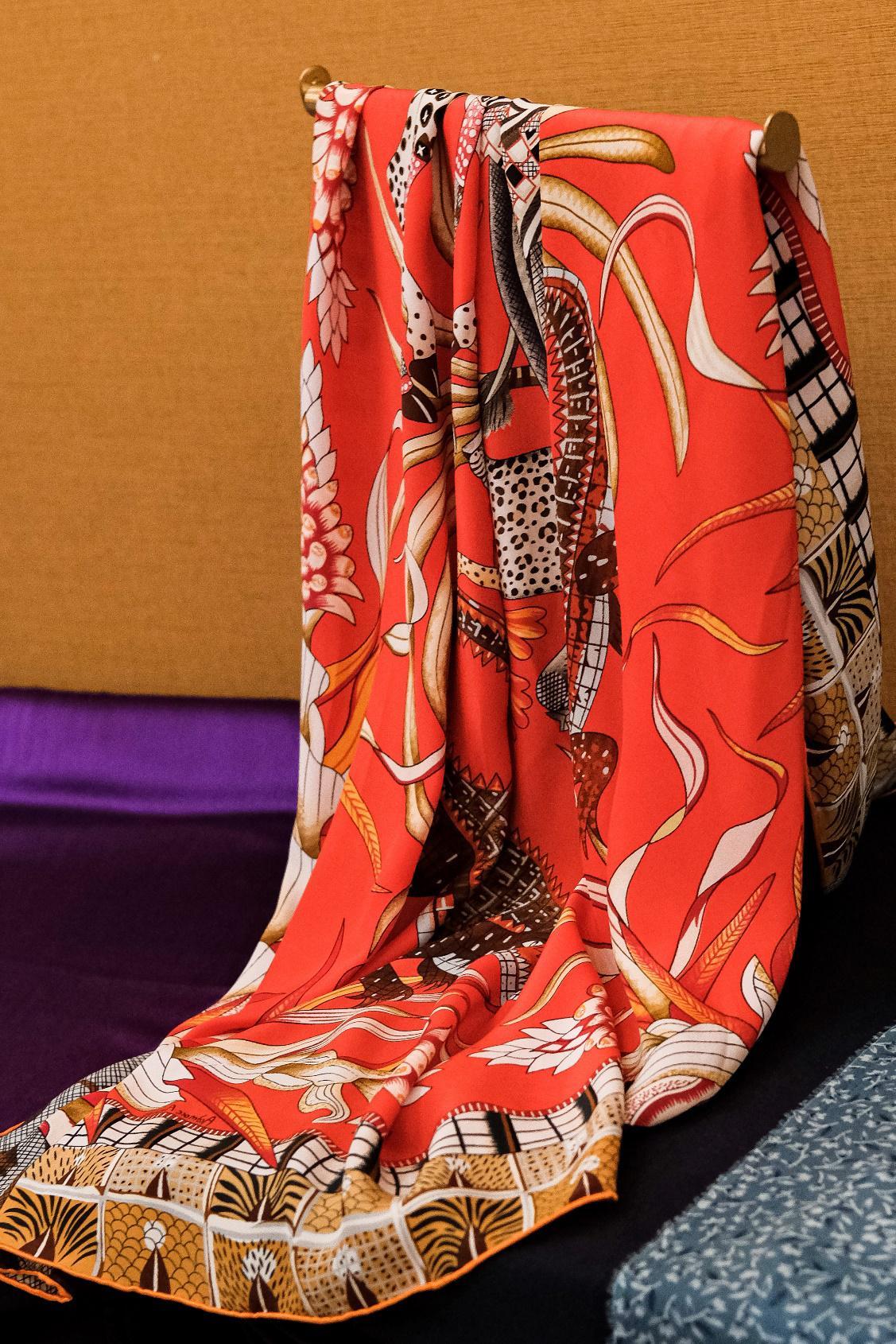 大大的丝绸披肩上色彩明艳斑斓,花纹繁复又排列的恰到好处。除了柔和光滑的亲肤感之外,丝绸的光泽感又让这些披肩的靓丽更添几分风采,仿佛拢上一层柔滑的光晕。