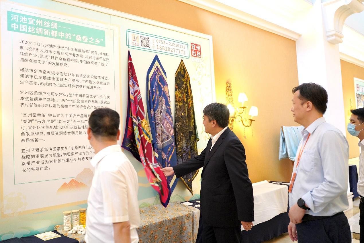 缤纷鲜艳又款式多样的河池丝绸吸引了诸多来宾游览观赏。领导们随着讲解员的解说一一观赏了精美多彩的丝绸织品,了解丝绸特点和企业生产状况。到场的嘉宾们也纷纷亲自上前感受丝绸面料的魅力。